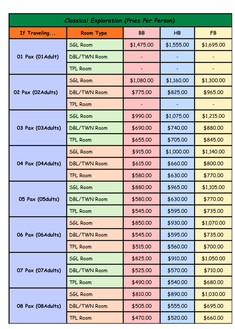 - This itinerary includes budget-friendly accommodations and all transportation costs. However, entrance fees and activity fees mentioned in the itinerary are not included. A supplement can be arranged upon request to cover these fees.