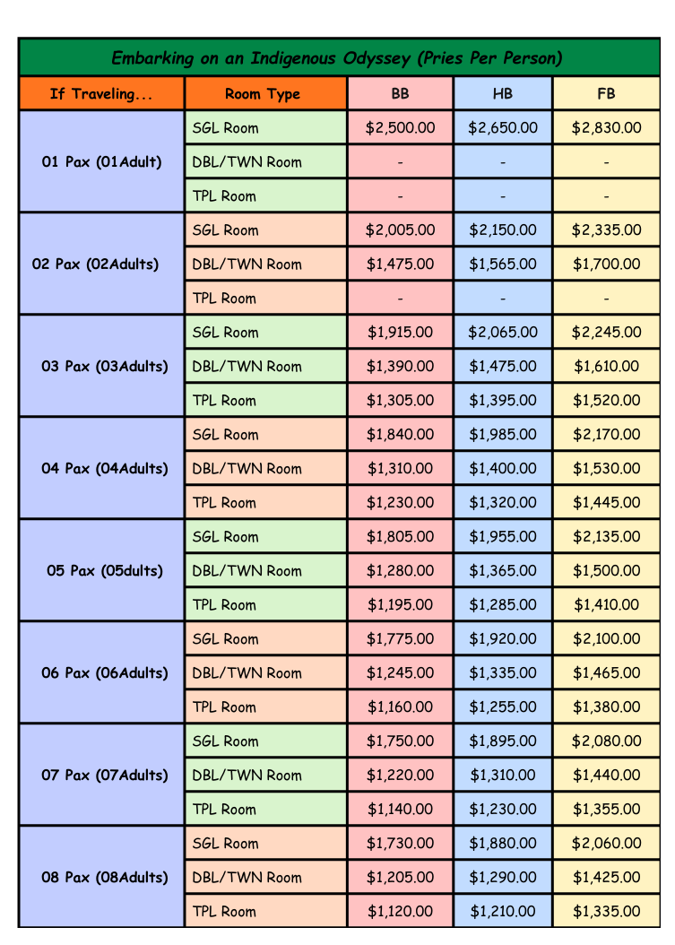 Rates provided below are quoted on a Per person Basis.