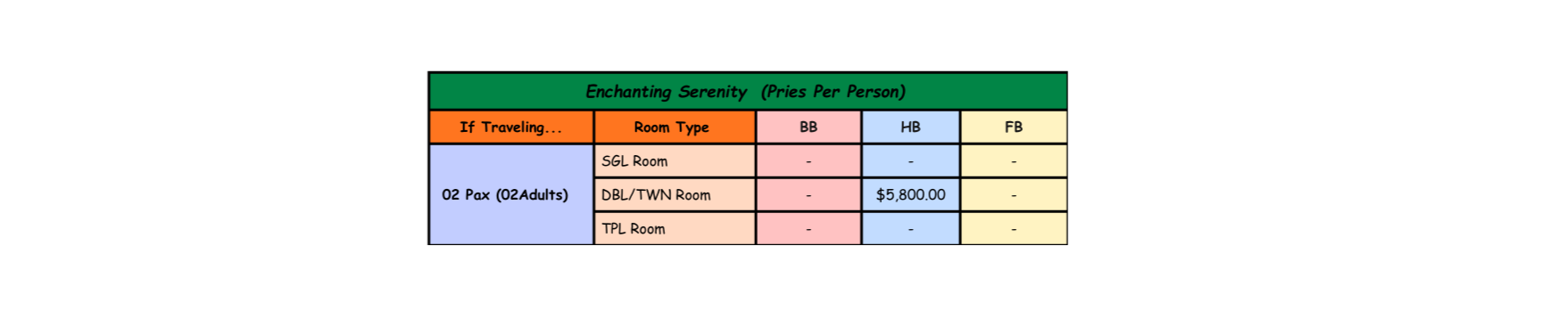 Rates provided below are quoted on a Per person Basis.