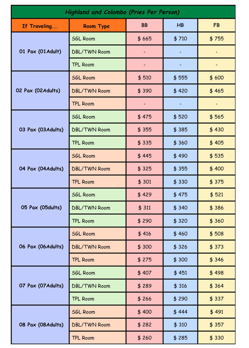 - The above prices does not include special season supplements such as Kandy Perahera/Christmas Eve/New Year Celebration.