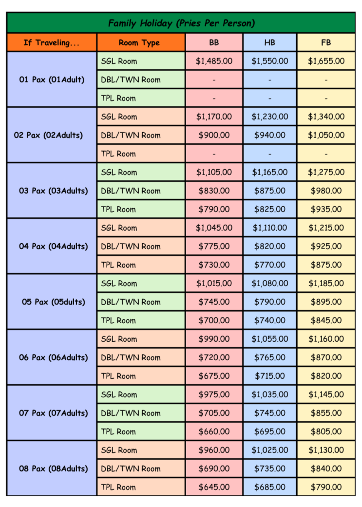 • The above prices does not include special season supplements such as Kandy Perahera/Christmas Eve/New Year Celebration.