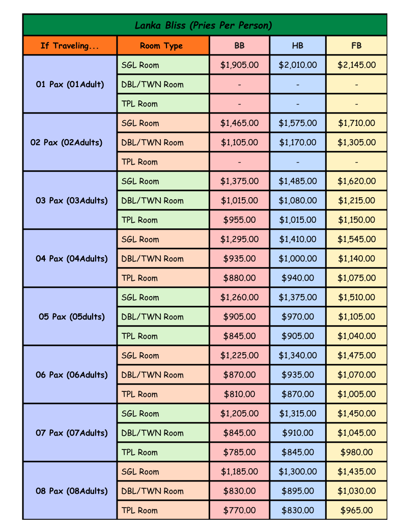 - The above prices does not include special season supplements such as Kandy Perahera/Christmas Eve/New Year Celebration.
