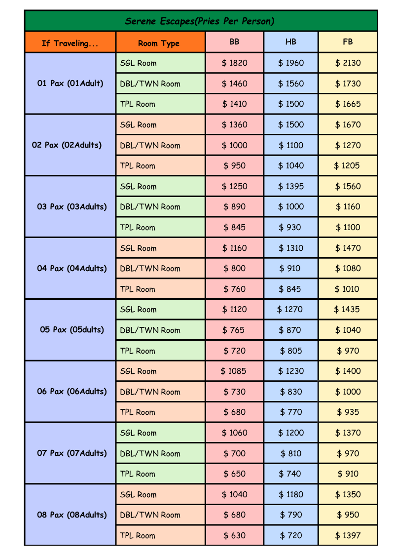 Rates provided below are quoted on a Per person Basis.