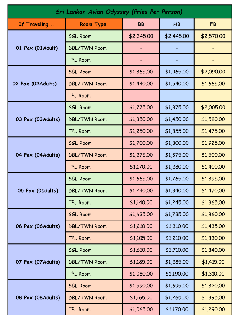 - The above prices does not include special season supplements such as Kandy Perahera/Christmas Eve/New Year Celebration.