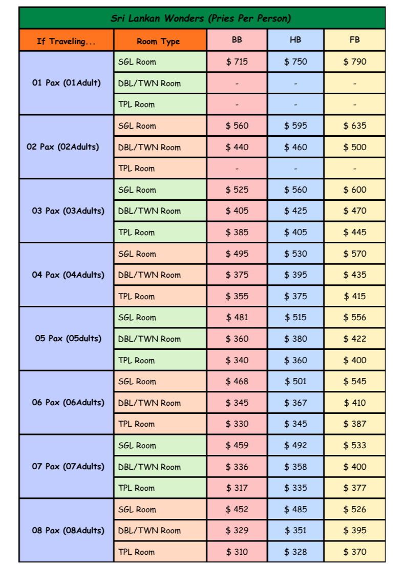 - The above prices does not include special season supplements such as Kandy Perahera/Christmas Eve/New Year Celebration.