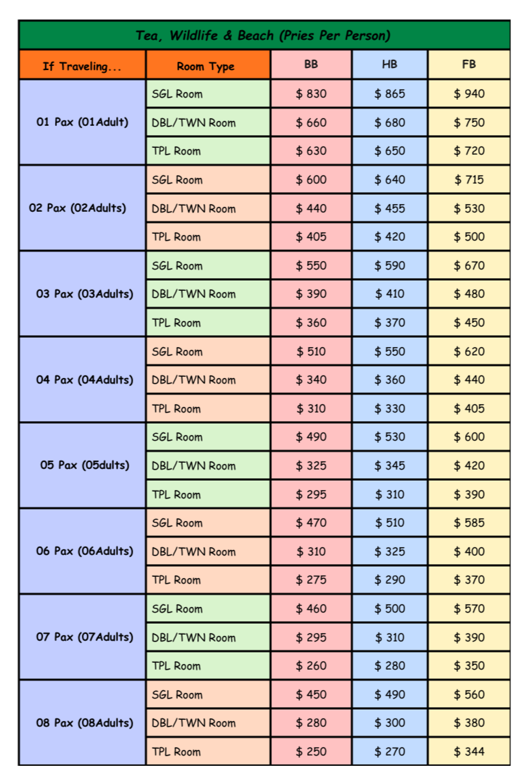 - The above prices does not include special season supplements such as Kandy Perahera/Christmas Eve/New Year Celebration.