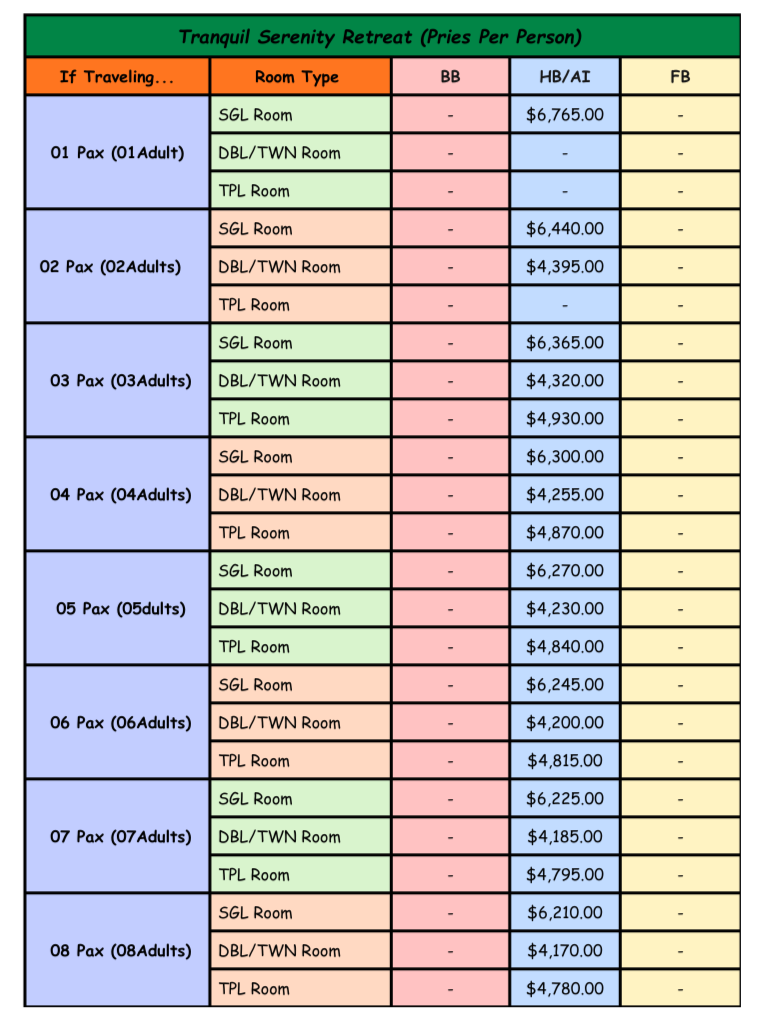 Rates provided below are quoted on a Per person Basis.
